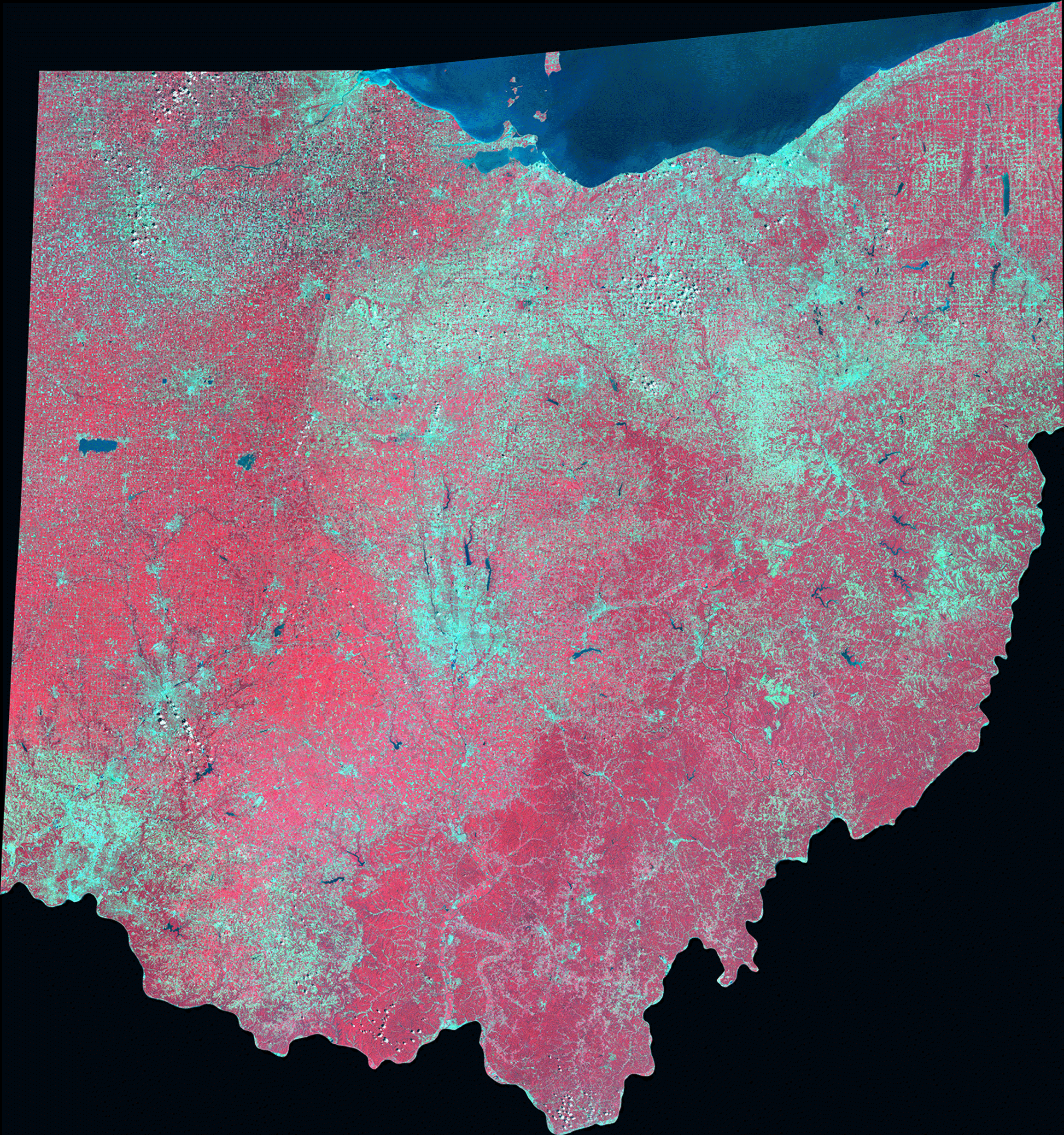 This image was created using ERDAS Imagine software. All nine Images were mosaiced together using the mosaic model function within ERDAS. Next, I sharpened the Image in Photoshop. Presently, this image is being used by Ohio Aeronautical Institute and the Cleveland Zoo. The area in which this project focuses on is in Southern Ohio. If you mouse over the southwestern section of the image, it will lead you to the Methods page and will tell you more about the area. This Area lies between Cincinnati, Ohio and the thicker forest growth of Southern Ohio region. By looking at the satellite image above, Cincinnati is in the southwest corner (the bluish gray area) and the vegetative forest area is to towards the southern center of the image. This feature is the area of interest. The location is known as Southern Niagara Escarpment. This web site will be the precursor a study that The Department of Geography and Planning and the Geographic Information Science and Applied Geographics Lab will be doing this summer. This site will be updated in late August